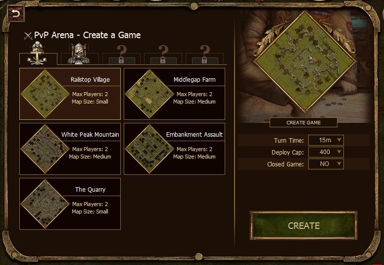 Setting up a battle is simple, with options such as the maximum turn time limit, the deploy cap (the smallest being 400 and the largest being 1000), whether the game is invite only, and of course what map you will fight over! The maps currently available include a mostly open farm with a large chunk of impassable terrain causing two chokepoints near the center, a village map with narrow streets and many small pieces of cover, and of course several more. When you’ve chosen your battle settings, you can either invite people to the game, or wait for someone to join.